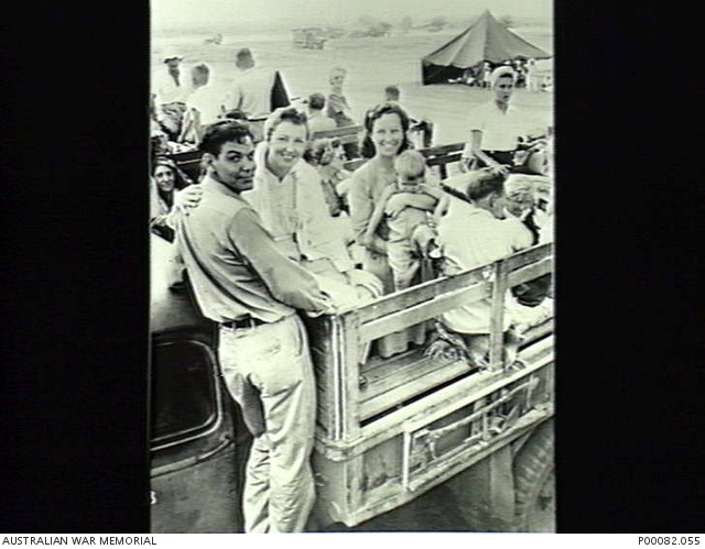MANILA, THE PHILIPPINES, 1945. FORMER INTERNEES IN A TRUCK AT NICHOLLS FIELD AIRSTRIP PRIOR TO LEAVING FOR AUSTRALIA AFTER LIBERATION. FROM LEFT, ABE (SURNAME UNKNOWN) AND PAULA PRATT, WHO WERE ENGAGED TO BE MARRIED; MARIE PRESTON HOLDING PAM BUTTFIELD, WHO WAS BORN IN THE SANTO TOMAS UNIVERSITY INTERNMENT CAMP. (DONOR: B. COOPER).
