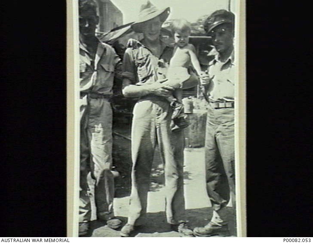 SANTO TOMAS, THE PHILIPPINES, 1945. SERGEANT MATT LACEY; LEADING AIRCRAFTMAN BLUE CUTLER AND FLYING OFFICER BRUCE COOPER, OF THE 6TH WIRELESS UNIT, RAAF. CUTLER IS HOLDING PAM BUTTFIELD, WHO WAS BORN IN THE SANTO TOMAS UNIVERSITY INTERNMENT CAMP. (DONOR: B. COOPER).