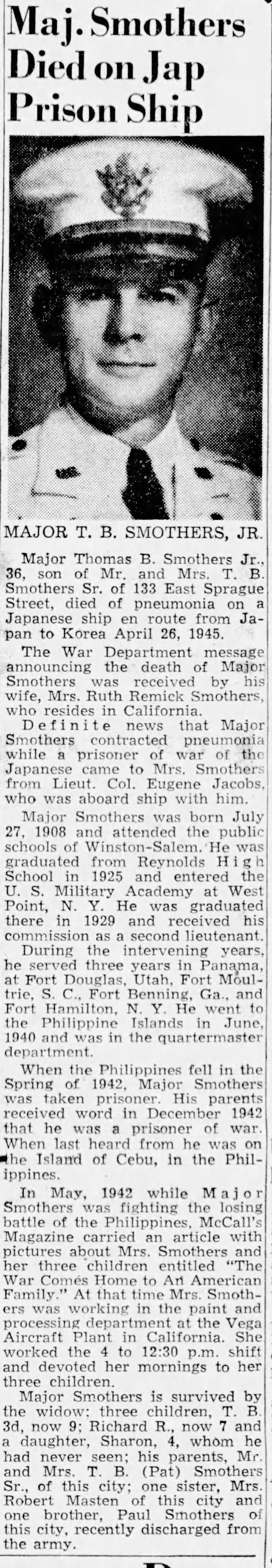 Smothers-Thomas-1945-Died-on-Japanese-prison-ship Published January 24, 2024 at 714 × 4114 in Smothers-Thomas-1945-Died-on-Japanese-prison-ship ← Previous Next → Major Thomas Smothers Died on Japanese prison ship Share this:Click to share on Facebook (Opens in new window)Click to share on Pinterest (Opens in new window)Click to share on Tumblr (Opens in new window)Click to share on Twitter (Opens in new window)